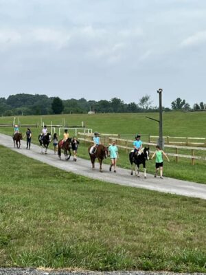 Groups are formed by age and previous riding experience, to allow everyone to get the most out of their daily lessons. Ample assistance is provided for “new horse people”.